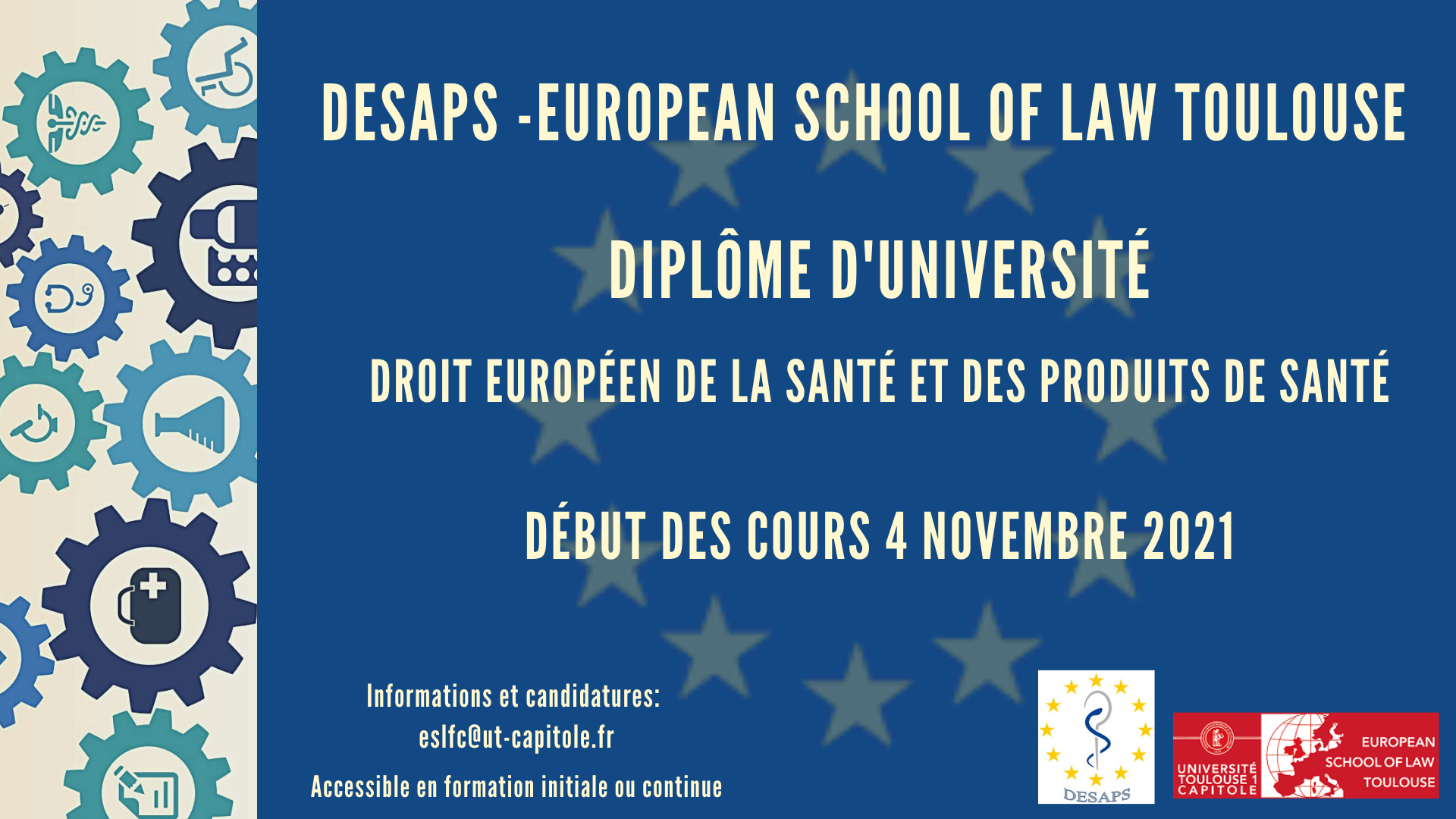 Les candidatures pour le Diplôme d'université en Droit européen de la santé et des produits de santé (DESAPS) sont ouvertes.