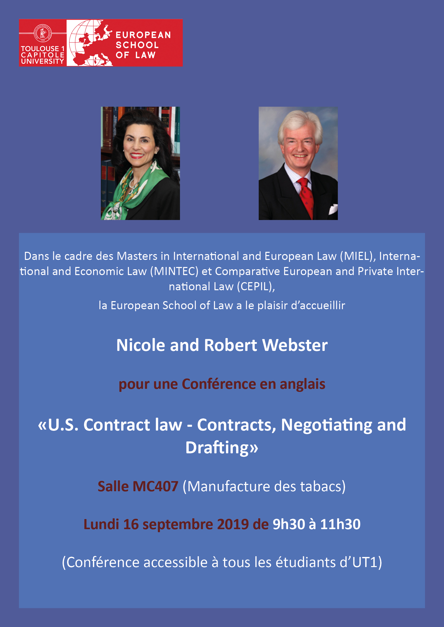 Invited by the European School of Law, Nicole and Robert Webster, University of Southern California professors, will give a lecture in English about "U.S. Contract Law / Contracts, Negotiating, Drafting" (lecture in English and opened to all).