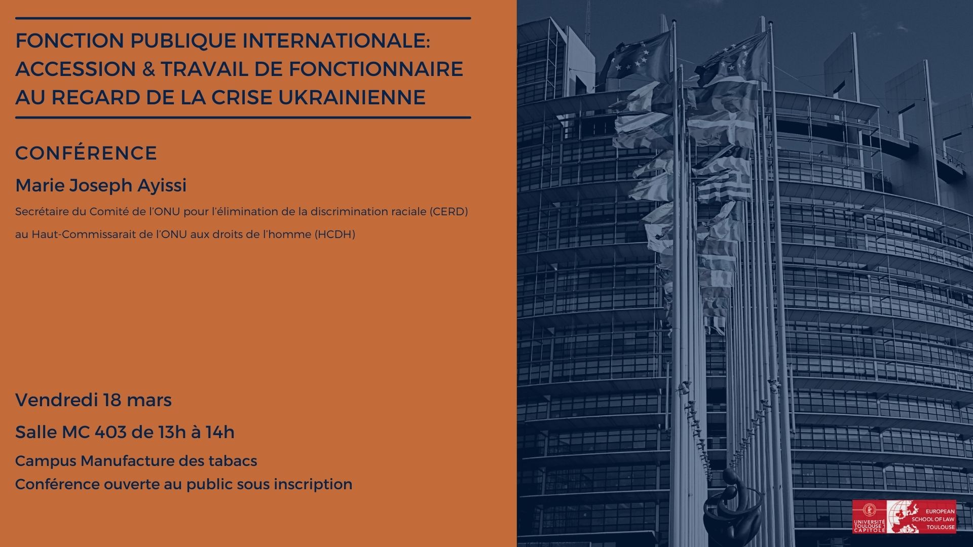Le Projet Conférences - Legal Culture est une initiative de l’ESLToulouse pour ses étudiantes et étudiants du niveau Master sur des sujets transversaux de droit européen, de droit international, de droit comparé. À travers l’expertise des invités ainsi que la diversité des thèmes proposés l’objectif est de consolider les acquis théoriques par une perspective pratique.