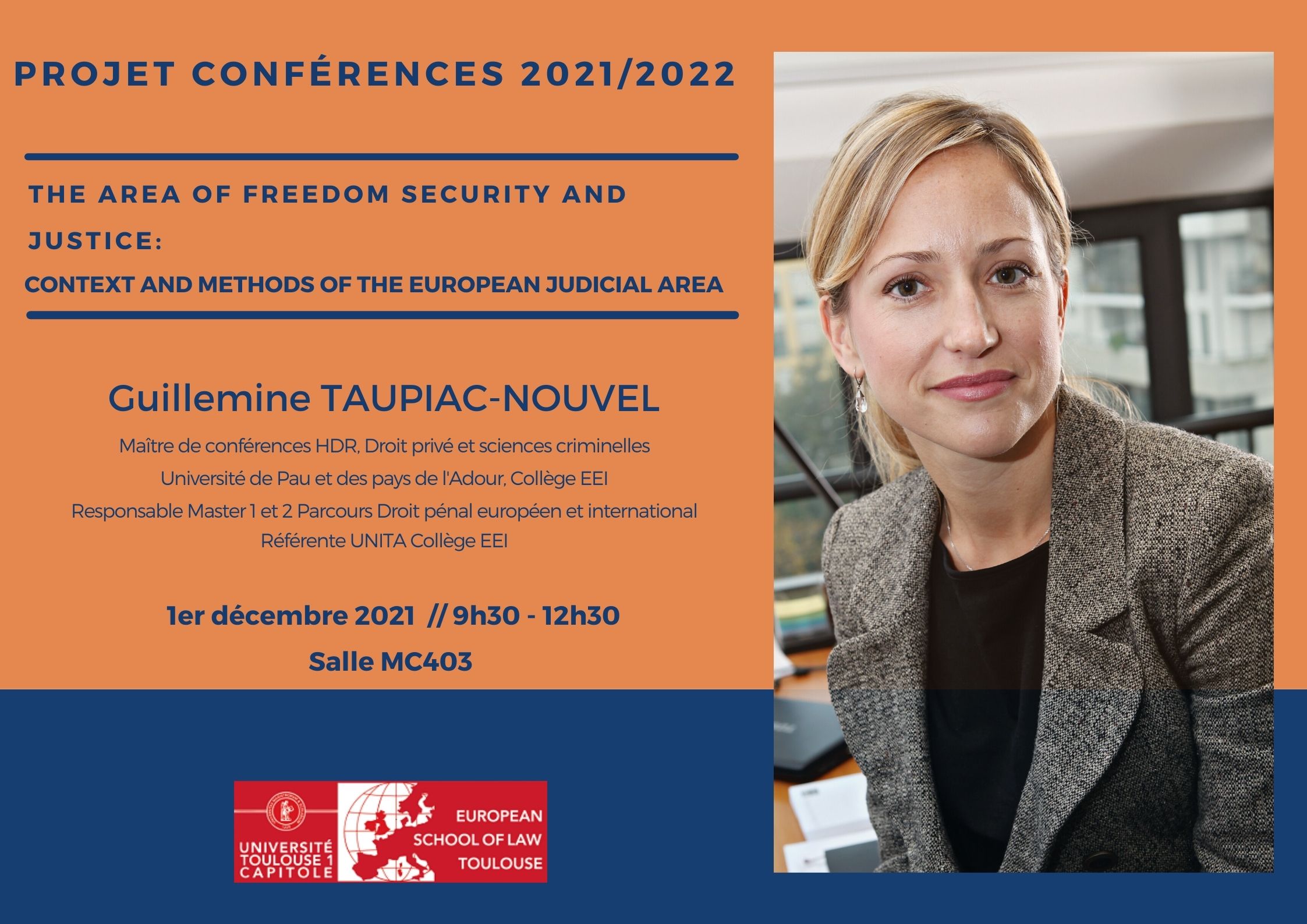Pour la première conférence on accueille Guillemine Taupiac-Nouvel, Enseignant-chercheur et Maître de conférences HDR au Collège d'Etudes européennes et internationales de l'Université de Pau et des Pays de l'Adour qui échangera sur le sujet : The Area of freedom security and justice- Context and methods of the European judicial area.