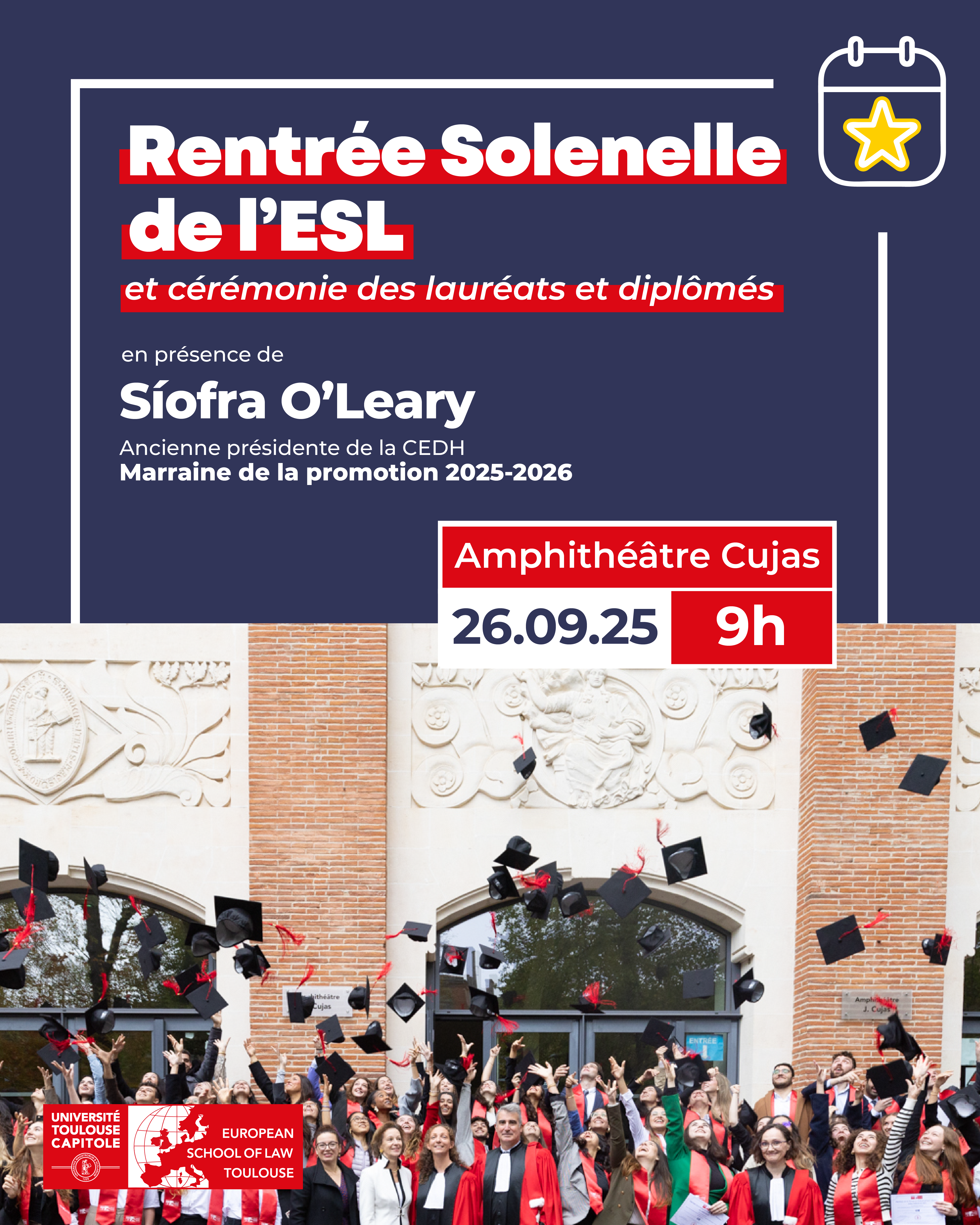 Comme chaque année, la European School of Law - Toulouse organise sa Rentrée solennelle afin de mettre à l’honneur les diplômés ainsi que les lauréats de chaque promotion.