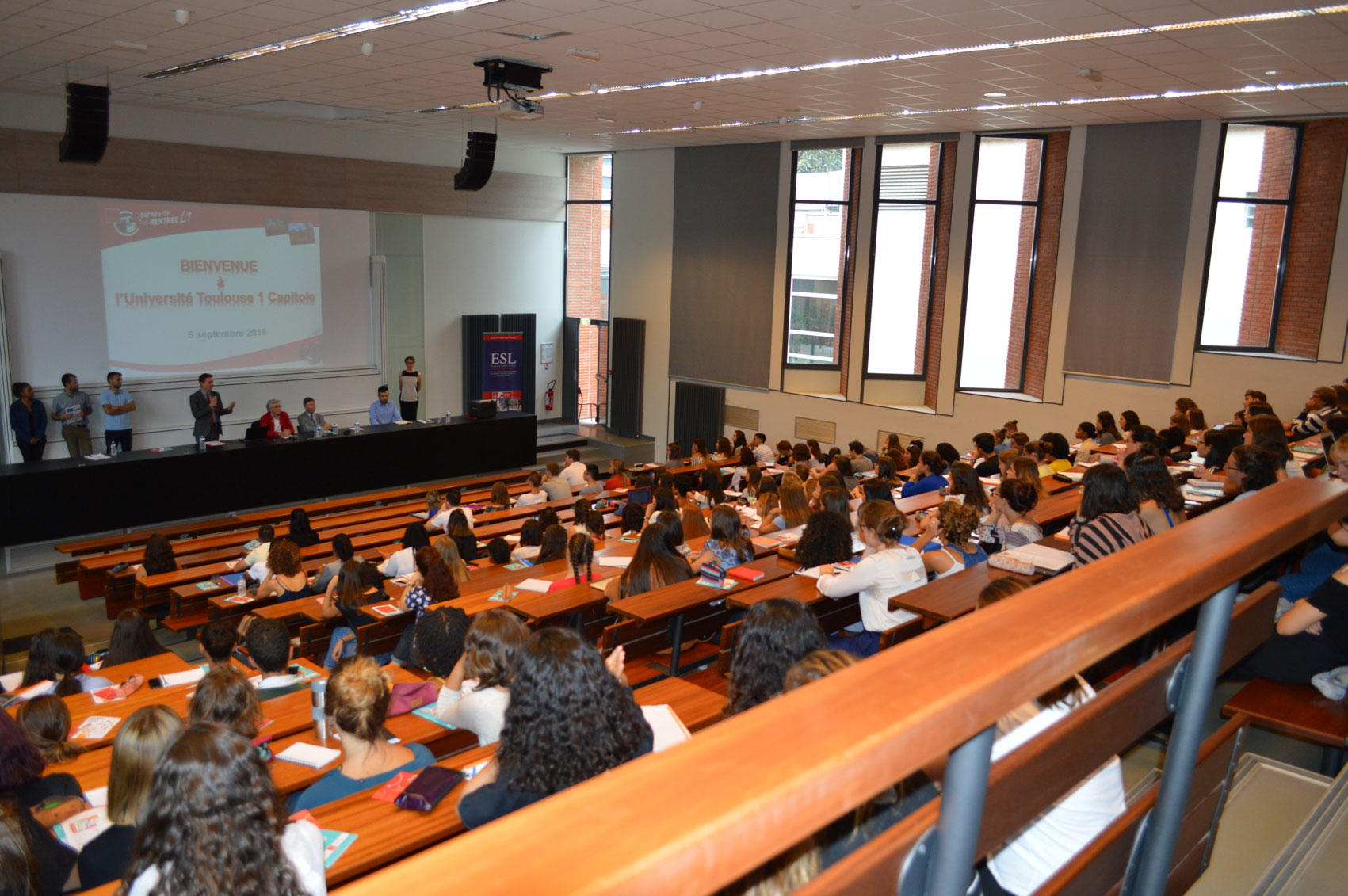 Après les discours de Mme Corinne Mascala, Présidente de l'Université Toulouse Capitole, de M. Philippe Nelidoff, doyen de la Faculté de droit, du Vice-Président étudiant M. Mathias Salles et de M. Lukas Rass-Masson, professeur des universités en droit privé et directeur de l'ESL, les étudiants ont pu rencontrer l'équipe de l'ESL et obtenir des informations sur l'organisation et le fonctionnement de leur école.
