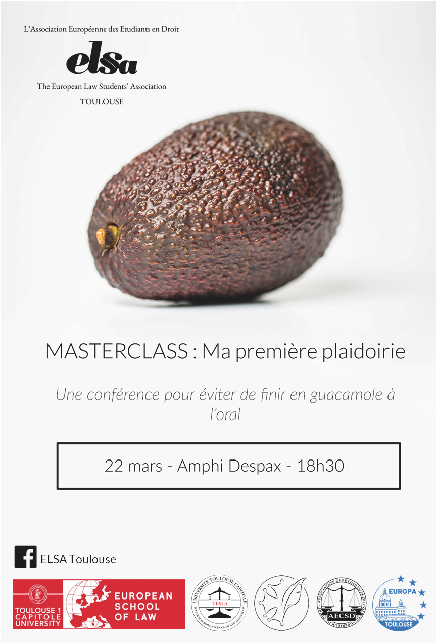 Elsa Toulouse, en partenariat avec l’ESL, la TESLA, Europa, l’AECSD et le Décodé, organise le 22 Mars une Masterclass « Avocat, ma première plaidoirie : pour éviter de finir en guacamole à l’oral ».
