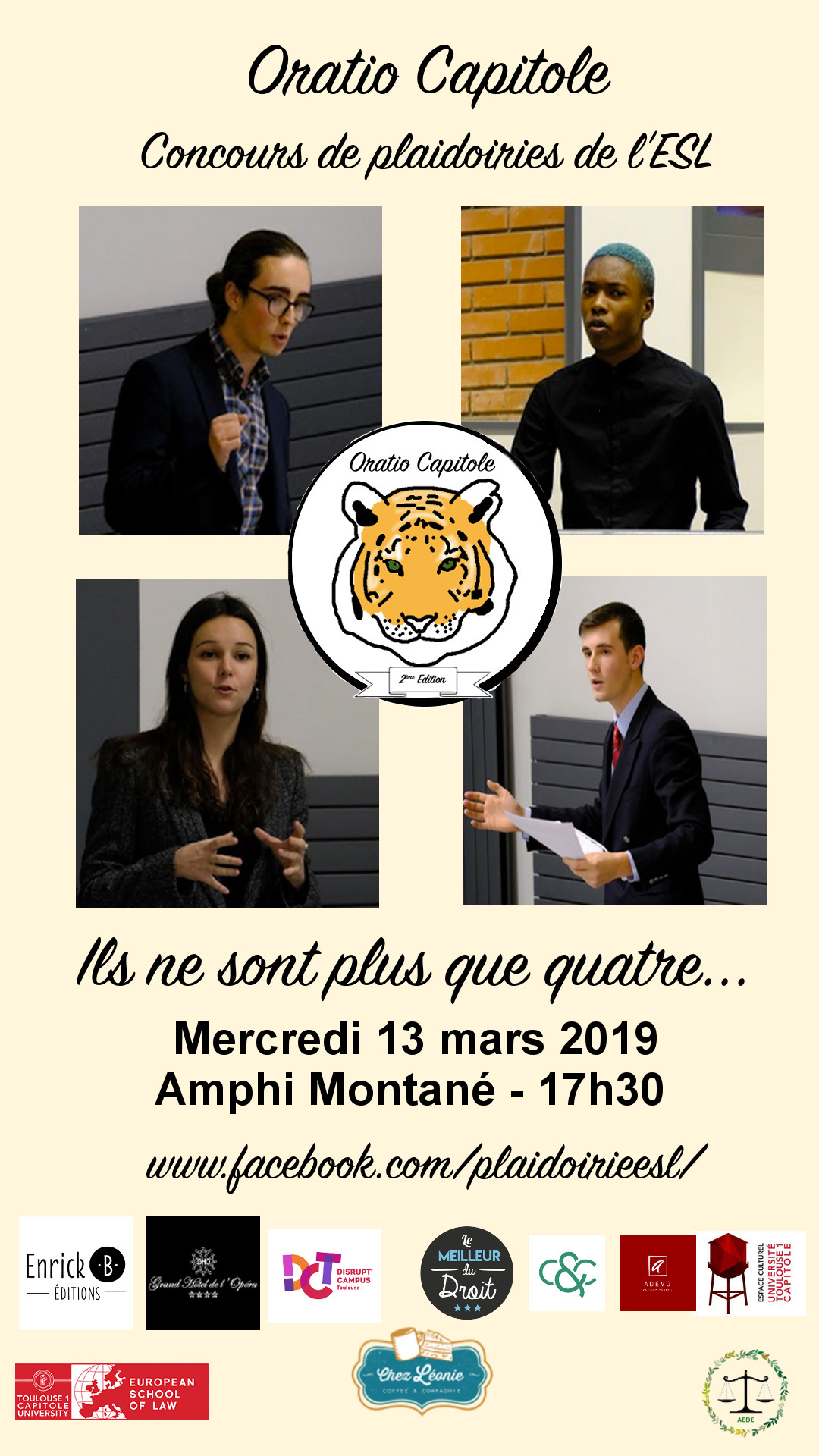 Après trois sessions de plaidoiries, le concours Oratio Capitole a désigné ses vainqueurs, lors de la finale du mercredi 13 mars 2019. Hodène Georges, étudiant de l'ESL, est le gagnant du concours, suivi de Robin Brizard, Laurie Antolin et Hughes de Courrèges, autre étudiant de l'ESL. Les prix de la meilleure progression Master et Licence ont été décernés à Rémy Basilio et Inès Ikhmim.