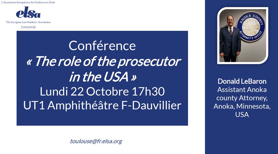 L'association ELSA Toulouse vous propose le 22 octobre à 17h30 à l'amphithéâtre Dauvillier, une conférence sur le rôle de procureur aux états-unis, avec comme invité monsieur Donald LeBaron, lui-même avocat procureur au Minnesota.